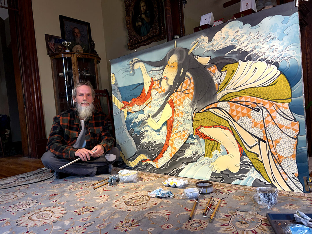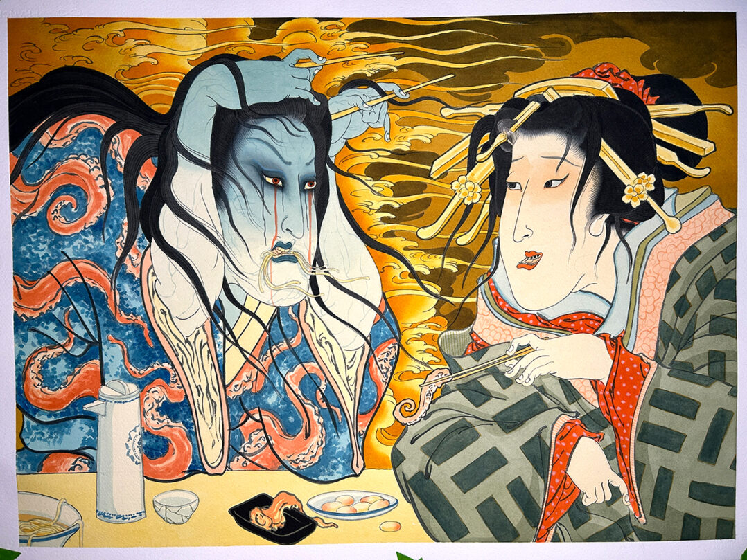 Tattooing is always my end goal in any art medium since I started and still is. I started painting to layout tattoo designs for myself and my client of what could be done, always leaning back to Ukiyo-e prints for inspiration and continued study of the imagery. As time went on I began branching out in my paintings to tell stories of lost history, current culture, and commentary about our modern cultural dilemma we face everyday.